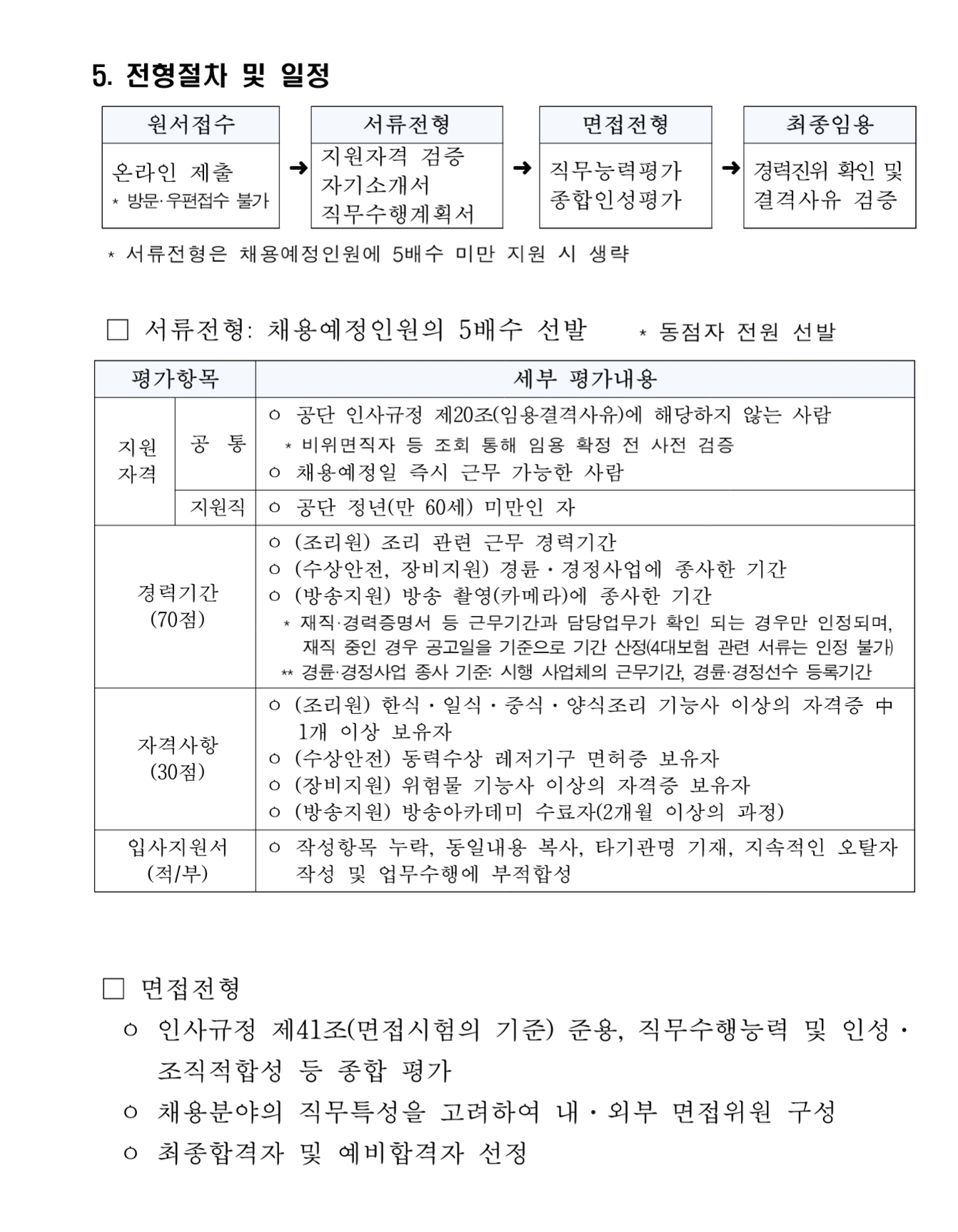 5. 전형절차 및 일정: 원서접수 > 서류전형(지원자 5배수 미만 생략) > 면접전형 > 최종임용