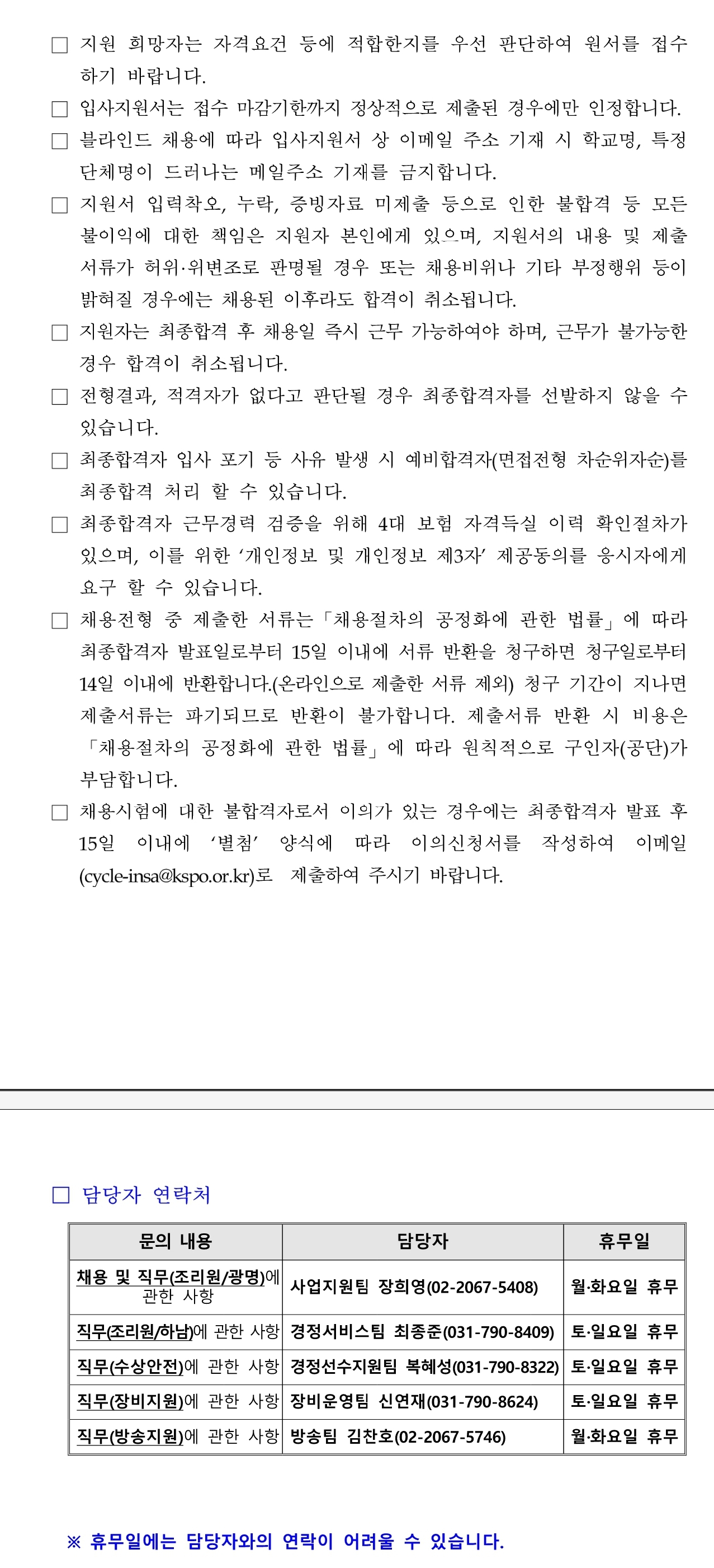 - 지원자격: (공통) 인사규정 제20조(임용결격사유)에 해당하지 않는 사람, 채용예정일 즉시 근무 가능한 사람/ (지원직) 연령 제한 없음 * 단, 채용공고일 기준 만 60세 미만인 사람