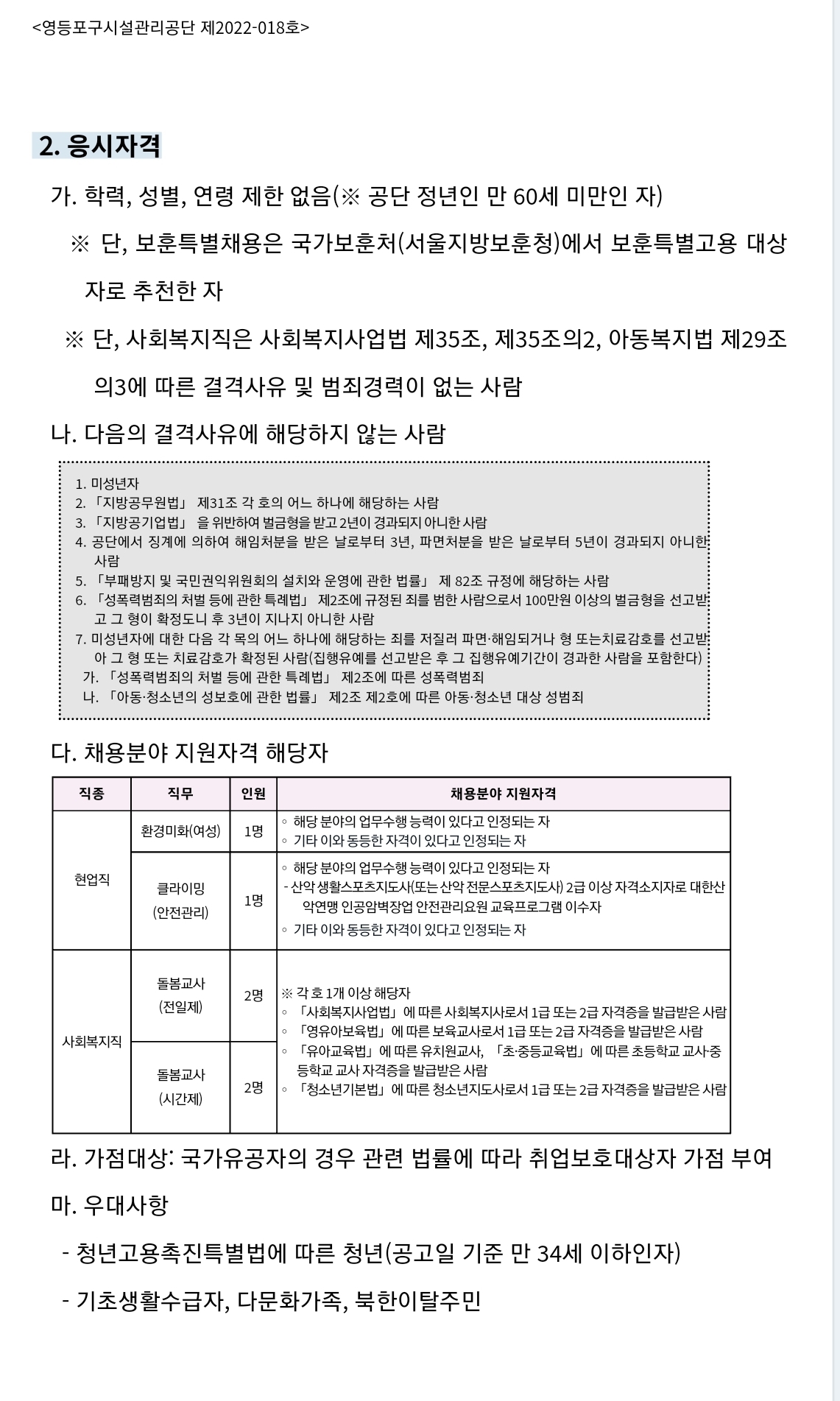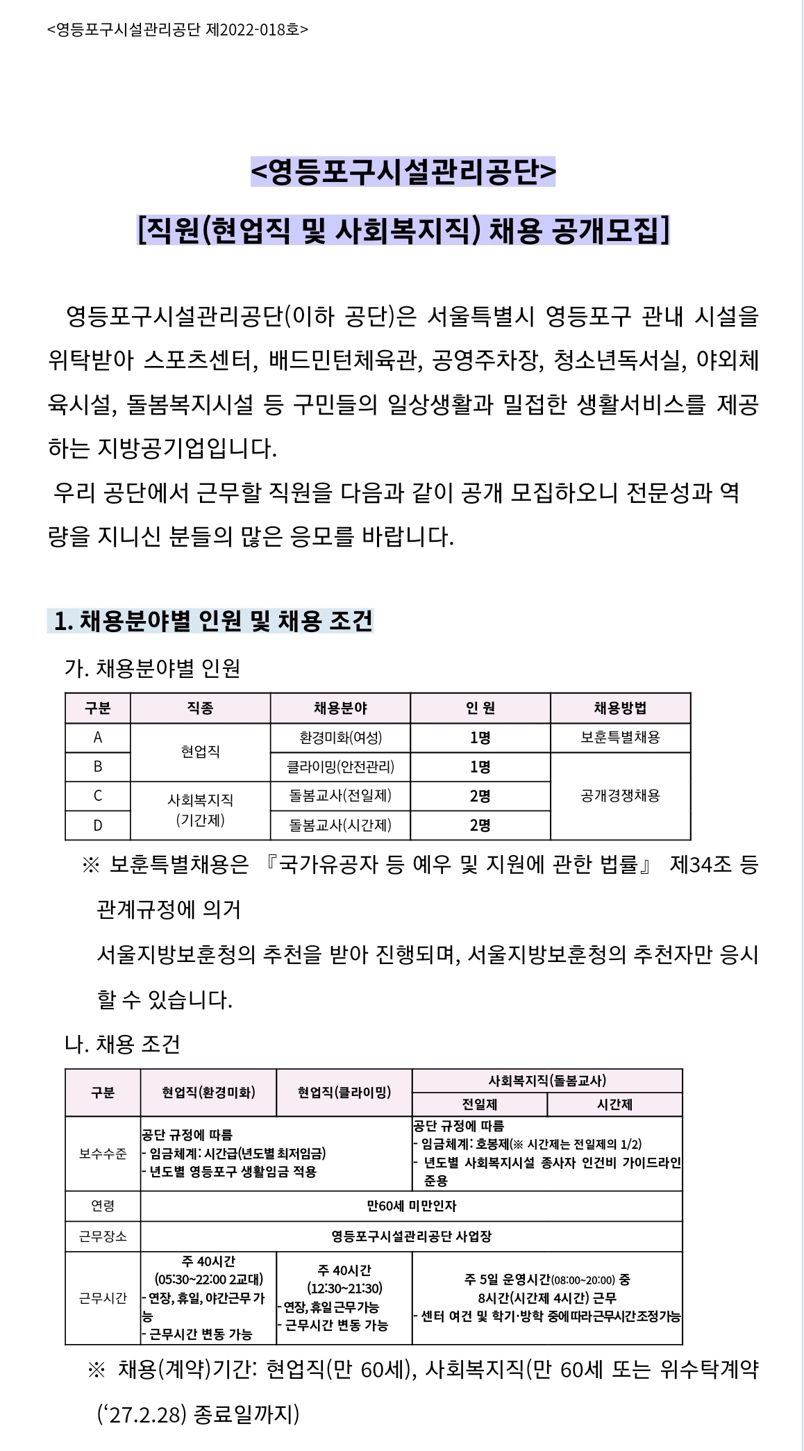1. 공 고 명: 영등포구시설관리공단 직원(현업직 및 사회복지직) 채용 공개모집